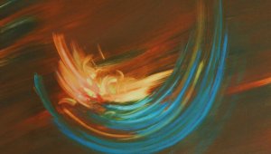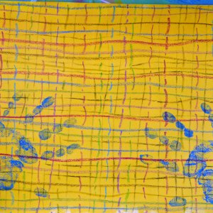 C. J’ai fermé les yeux et j’ai attendu un certain temps … des couleurs sont apparues puis une forme ; j’écoutais la forme montée en moi et je me suis laissée guidée par ma main. Étrange sensation de voire la vie se dire en « spectatrice » de cette main qui retraduit la Vie sur cette feuille… Je sentais ce qu’il manquait (un élément de la nature par exemple)…. et du coton pour mes potentialités douces.